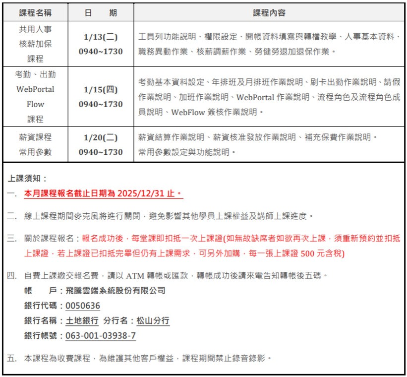 2026年 01月 HRM課程表