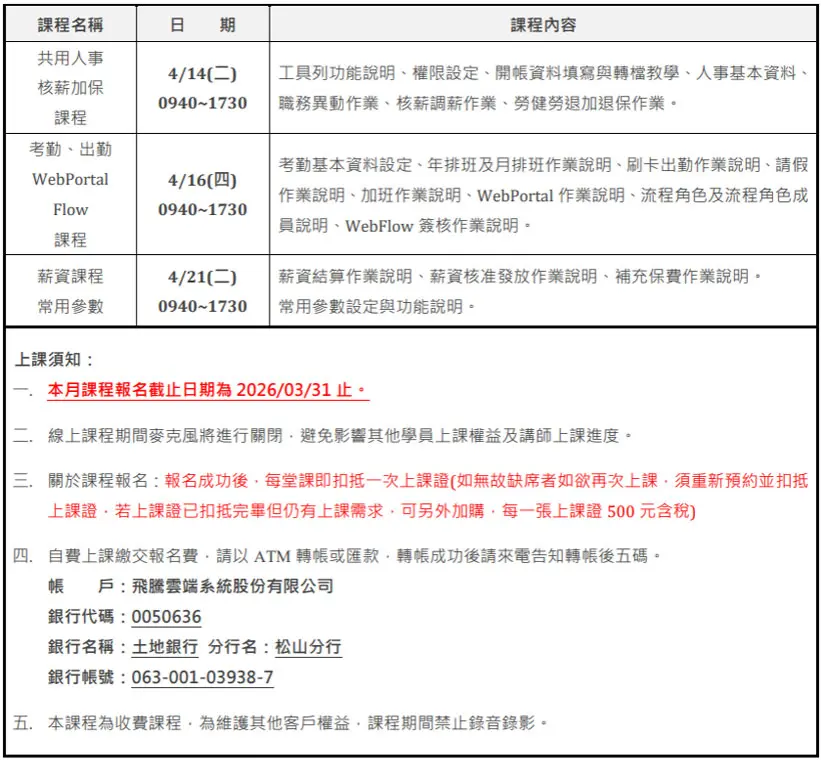 2026年 04月 HRM課程表