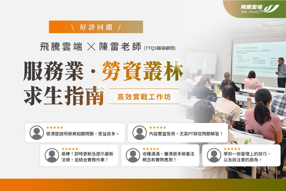 面對瞬息萬變的勞動法規,服務業 HR 與管理者每天都像在叢林中求生。為協助企業快速掌握合規管理重點,飛騰雲端於 10/22 舉辦《服務業勞資叢林求生指南》高效實戰工作坊,本次中部場已順利、熱烈地圓滿結束!
