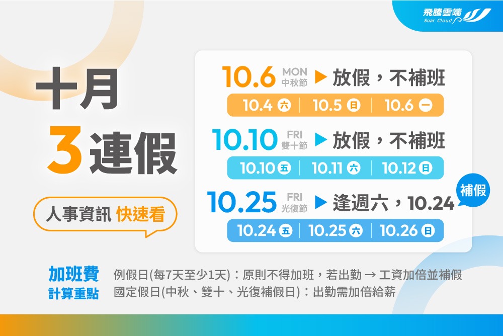 2025年因立法院修法新增國定假日,讓民眾享有更多休假機會。除了春節假期獲得保障外,下半年也將新增三個連假,加上既有的中秋節及國慶日連假,9月至10月份將會有多個連續假期,企業應及早準備,善用專業工具協助因應假期變動帶來的業務安排挑戰。