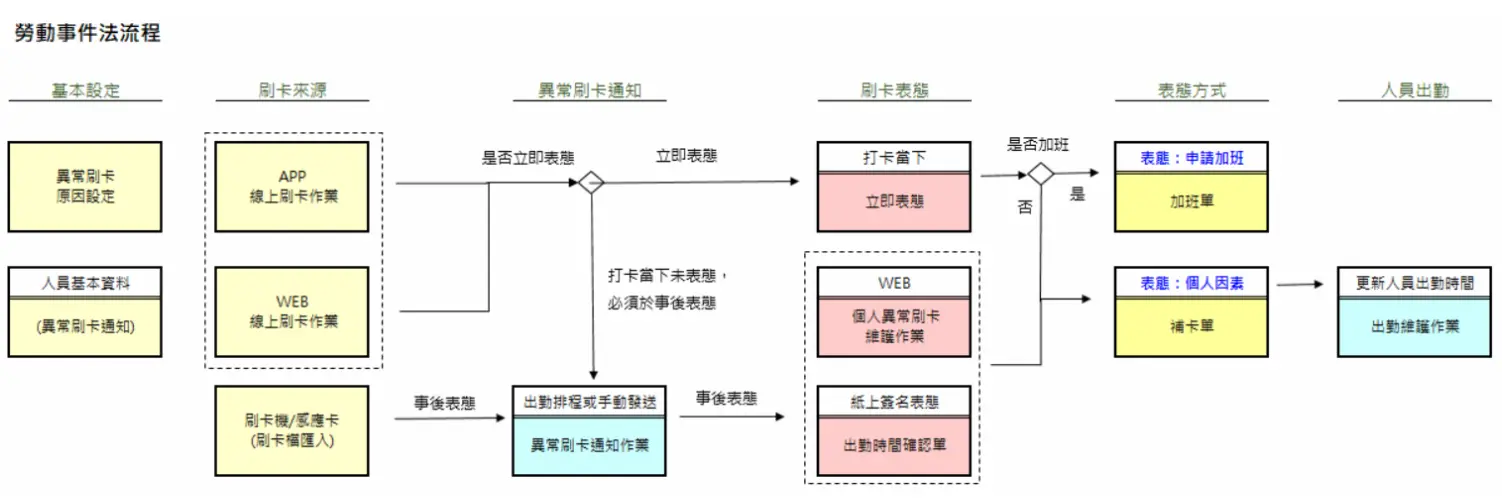 當系統啟用異常刷卡表態功能後,員工在 Web 或 APP 刷卡時,若時間超出設定範圍,系統將要求填寫原因或申請加班,並可由 HR 進行事後審核與管理。