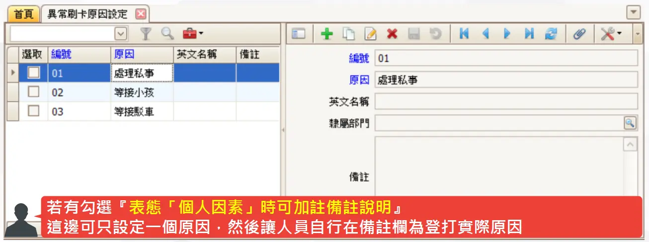 若公司允許員工自行填寫原因,可只建立一個原因,並讓員工在備註欄輸入實際說明。