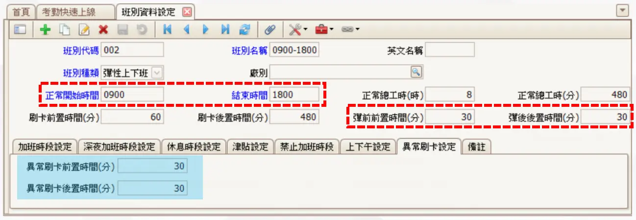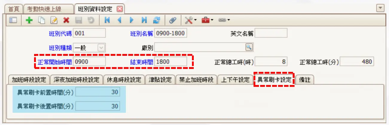 - 異常刷卡前置時間與後置時間建議依公司實際作息設定,例如提前到班或晚離開的容許範圍,避免正常情況被判定為異常。