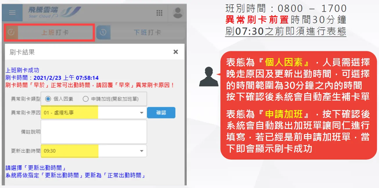 在企業出勤管理中,若員工刷卡時間早於班別開始時間或晚於班別結束時間,系統可要求員工進行「表態」,說明該筆刷卡原因,例如: