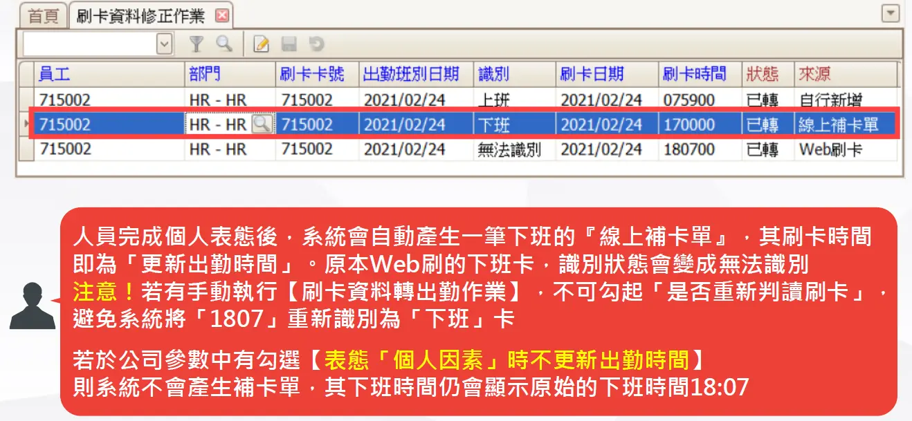 - 若設定「表態個人因素時不更新出勤時間」,系統將保留原始刷卡時間,不會自動產生補卡單。