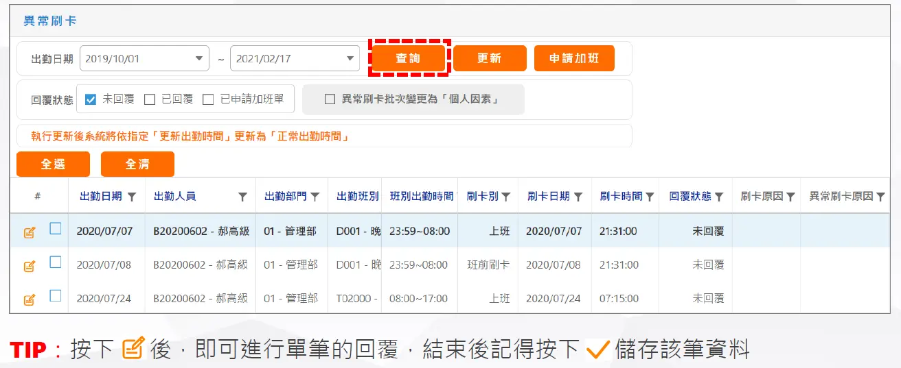 登入WEB → 個人異常刷卡維護作業,按下【查詢】即可查看未進行回覆的異常刷卡資料