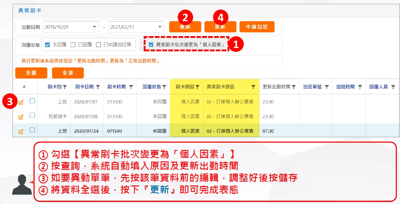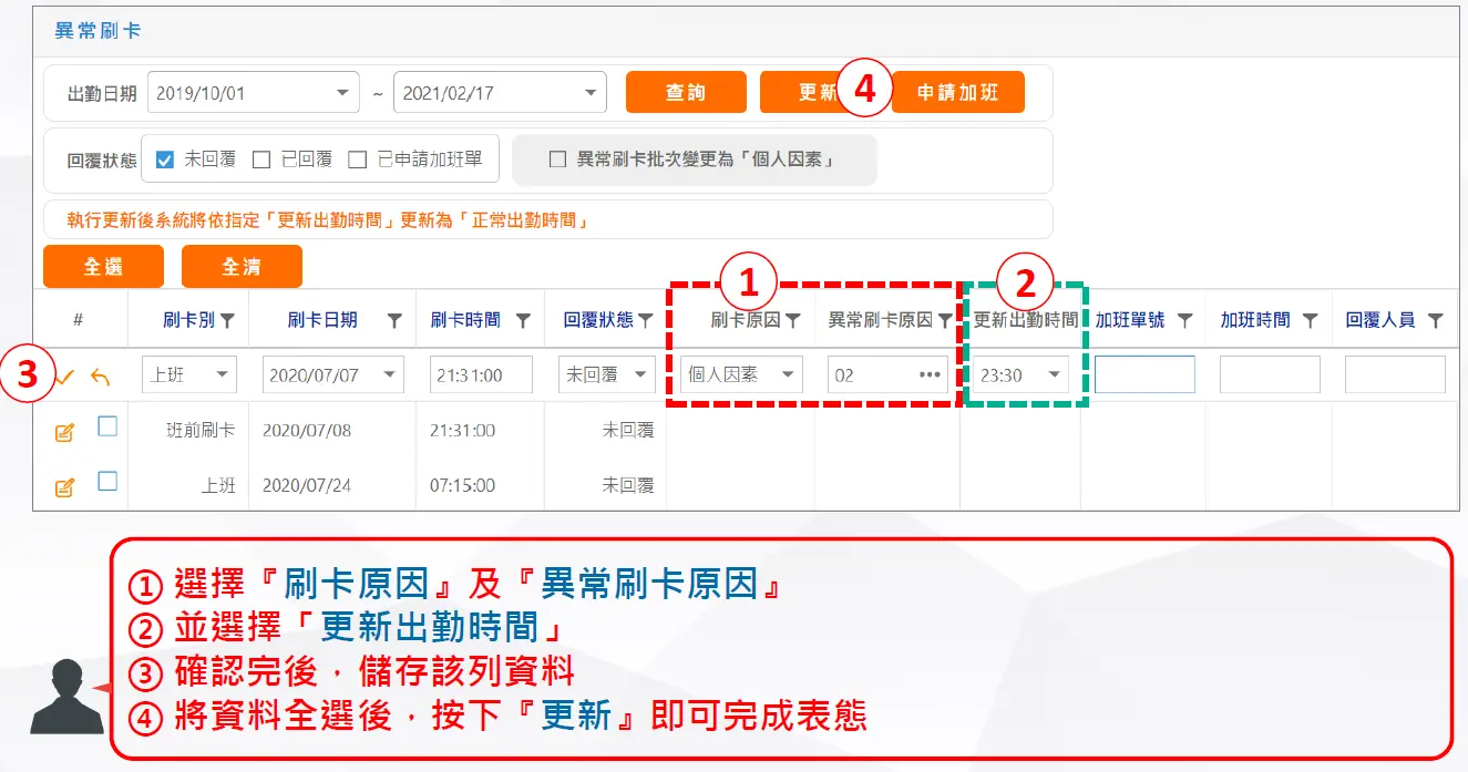 若未勾選,系統會自動產生補卡單並更新出勤時間。 - □ 表態原因限制為「個人因素」