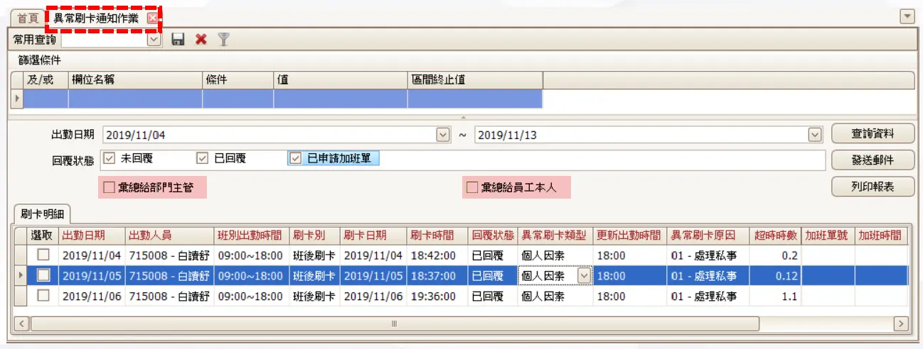 功能路徑:圖形選單 → 人員刷卡出勤作業 → 出勤異常通