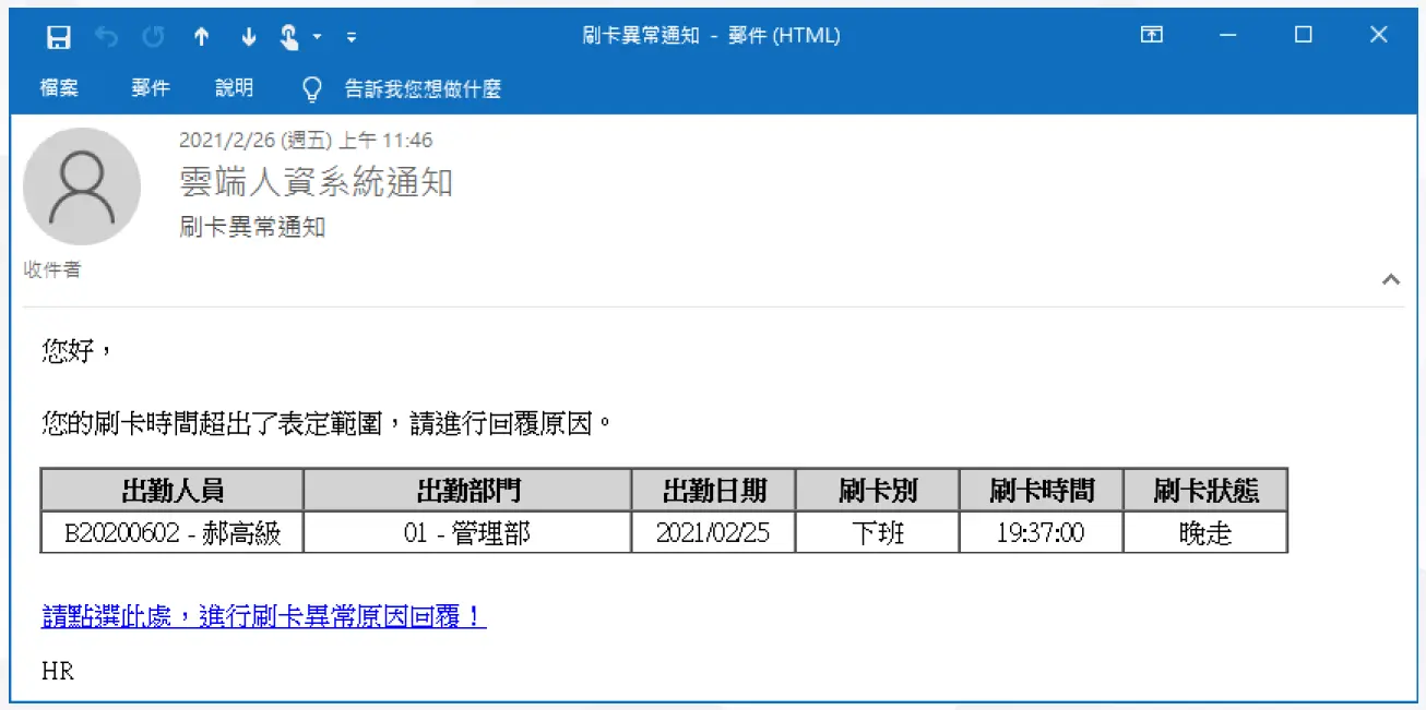 異常刷卡通知郵件內容