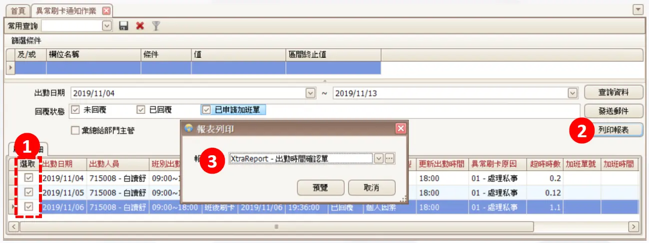異常刷卡通知作業– 列印報表