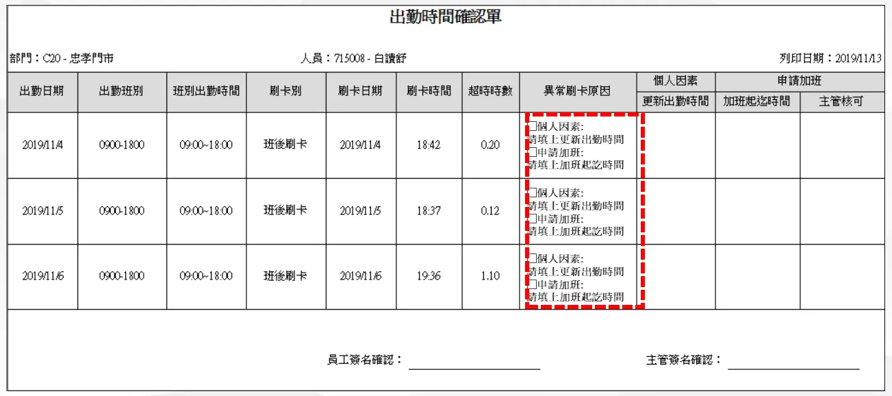 - 若公司未使用 Web 或 APP 進行回覆,也可透過列印出勤確認單,由員工紙本簽名後再由 HR 補登系統資料。