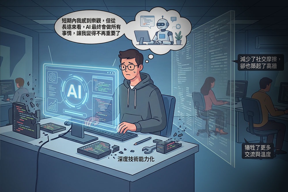 AI確實賦能了我們,讓我們能做得更多、更快、更有效率。但它也無情地剝離了我們透過「工藝」獲得的成就感,以及透過「協作」建立的歸屬感。